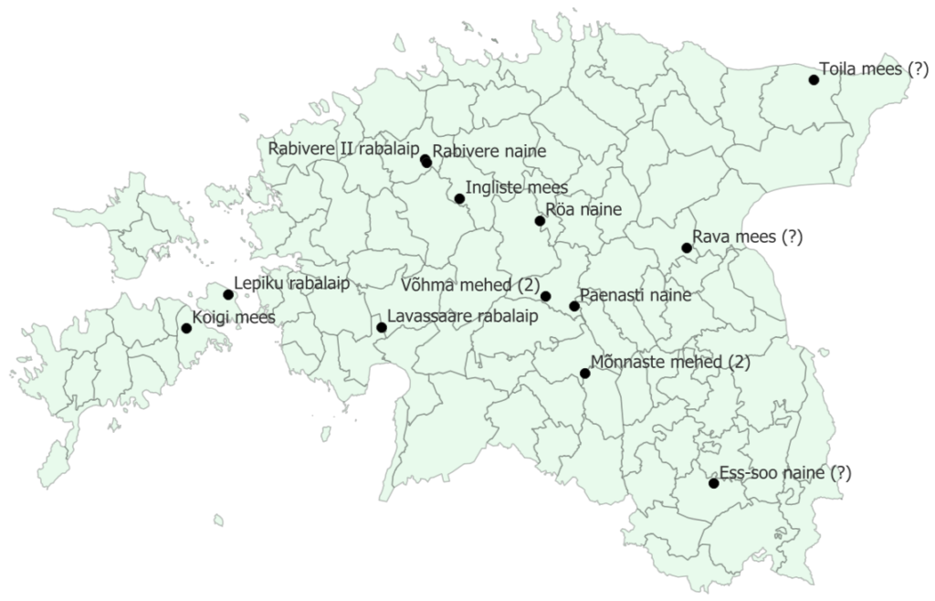Eelnevat arvesse võttes olen eristanud 15 rabalaipa, kusjuures kahel korral on tegemist paarismatustega. Need Eestist pärit leiud on kõik paberil “rabalaibad” ehk nendest on vaid informatsioon, et nad leiti, kuid nad ei ole ise tänaseni säilinud. Välja arvatud ühe erandiga, pole surnute täpset leiukohta ega -konteksti teada ning teadaolevad arvandmed ei pruugi olla täiesti usaldusväärsed.